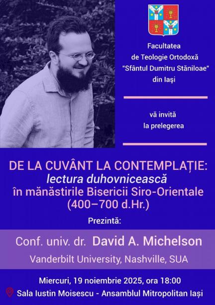 În această zi, în Sala „Iustin Moisescu” din cadrul Ansamblului Mitropolitan Iași se va desfășura evenimentul „De la cuvânt la contemplație: lectura duhovnicească în mănăstirile Bisericii Siro-Orientale (400–700 d.Hr.)”, organizat de Facultatea de Teologie Ortodoxă „Sfântul Dumitru Stăniloae” din Iași. Evenimentul îl are ca invitat pe conf. univ. dr. David A. Michelson de la Vanderbilt University, Nashville, SUA. Organizat în mediul academic teologic, evenimentul își propune să contribuie la cunoașterea mai bună a particularităților vieţii monahale din tradiția creştină siriacă. Ea explorează monahismului siriac de răsărit (sau siro-oriental) din Imperiul Sasanid, în perioada 400-700 d.Hr., mai exact modul în care monahii acestei tradiții au teoretizat și au practicat lectura contemplativă a Sfintei Scripturi.